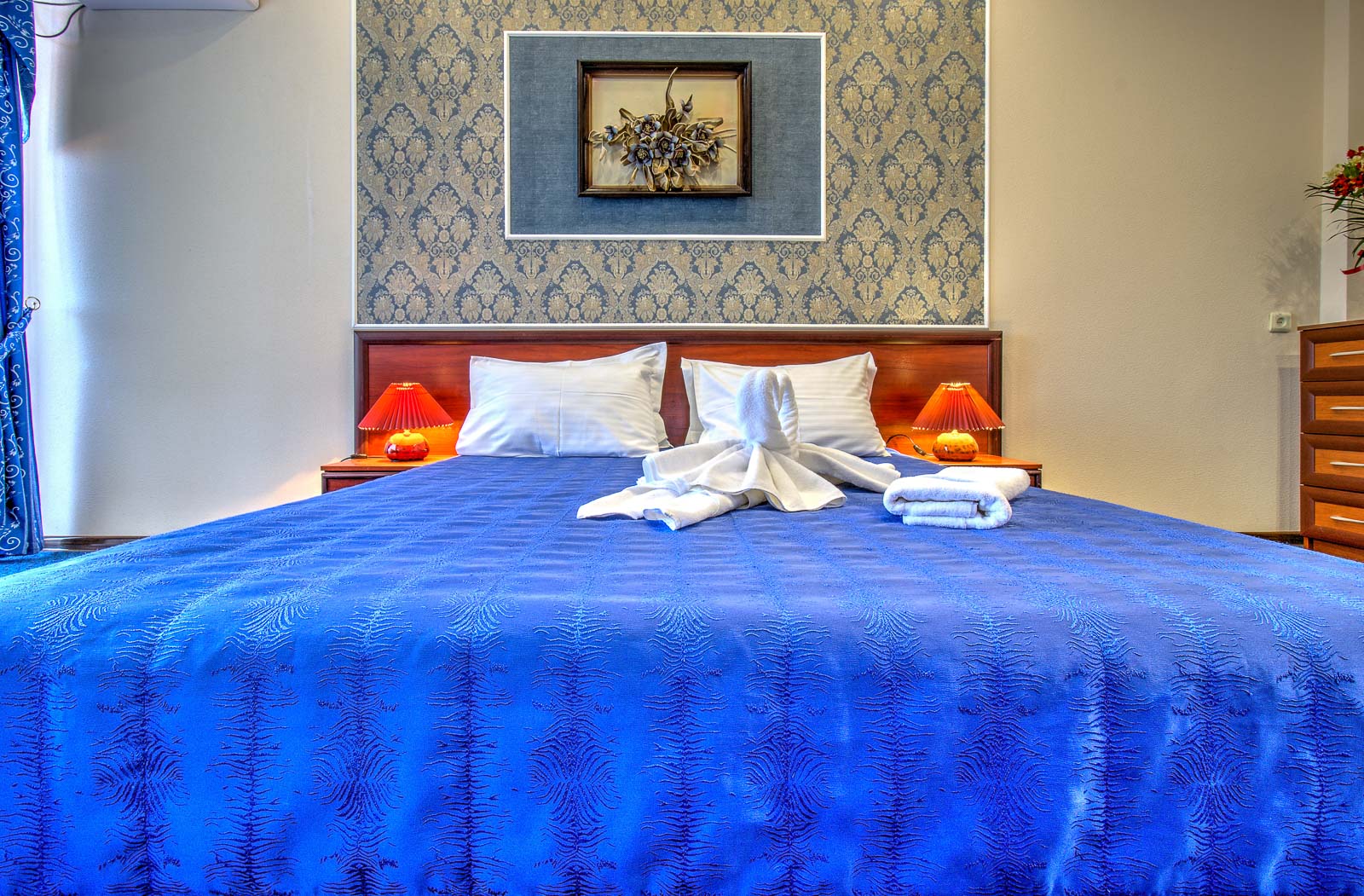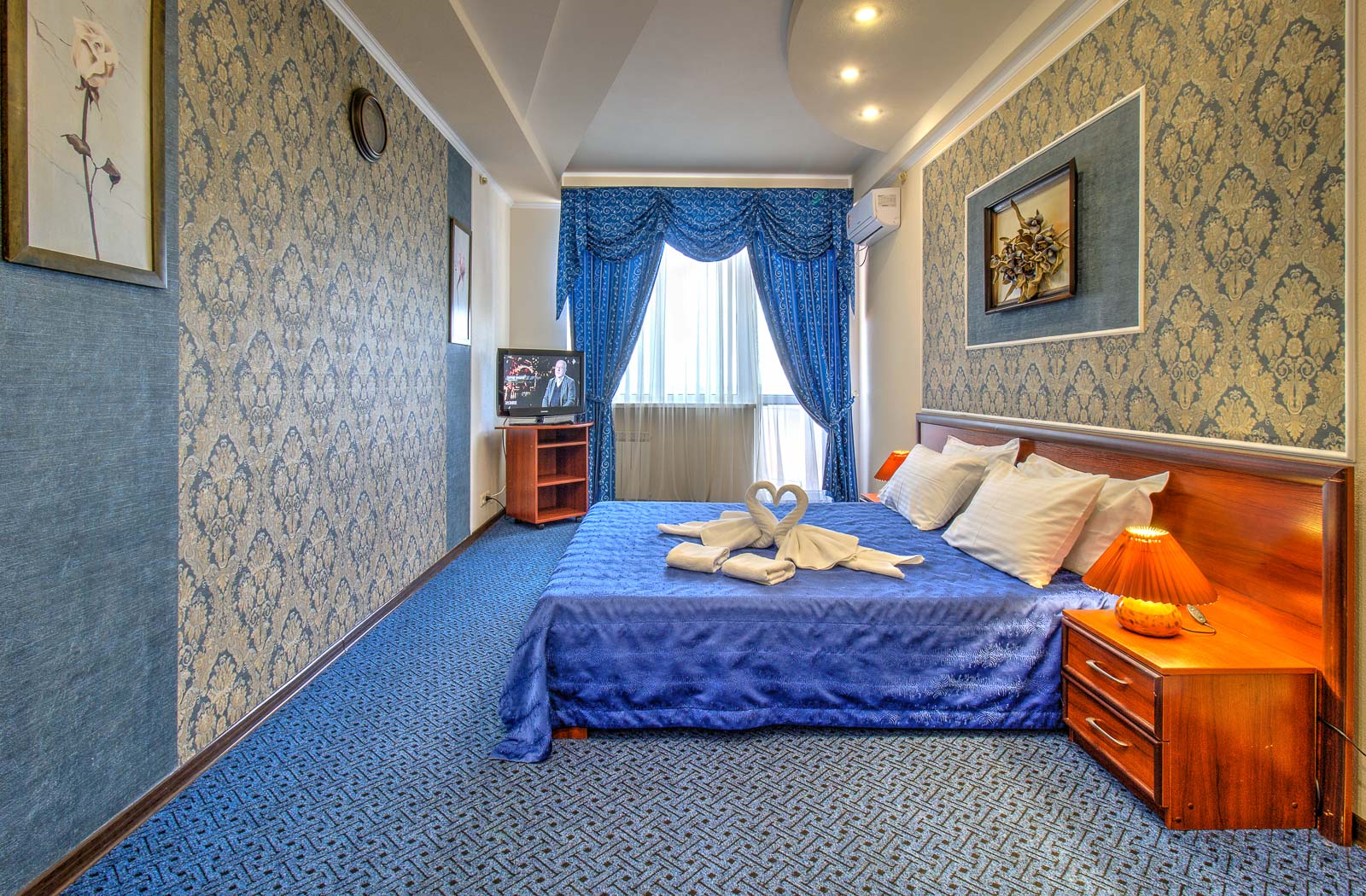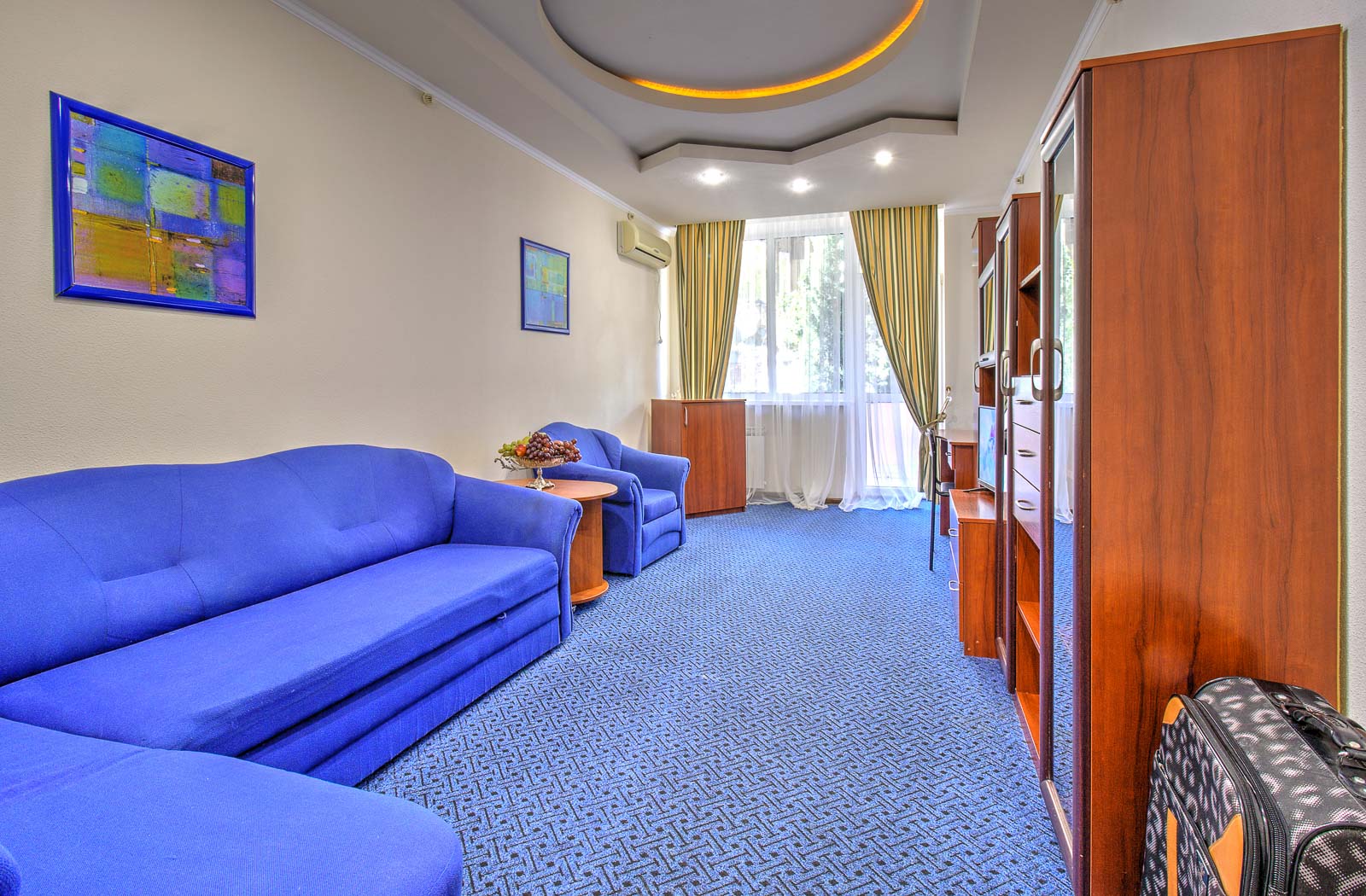 Площадь номера - 50 кв.м. 2 осн. места. 4 доп. места. Балкон. Мебель: вешалка, диван, зеркало, кресла, кровать двуспальная, прикроватные тумбочки, шкаф. Оборудование: кондиционер, телевизор, холодильник, электрочайник. Санузел: с душем, туалетные принадлежности, фен. Сервис: Wi-Fi бесплатно, смена полотенец, смена постельного белья, уборка номера.