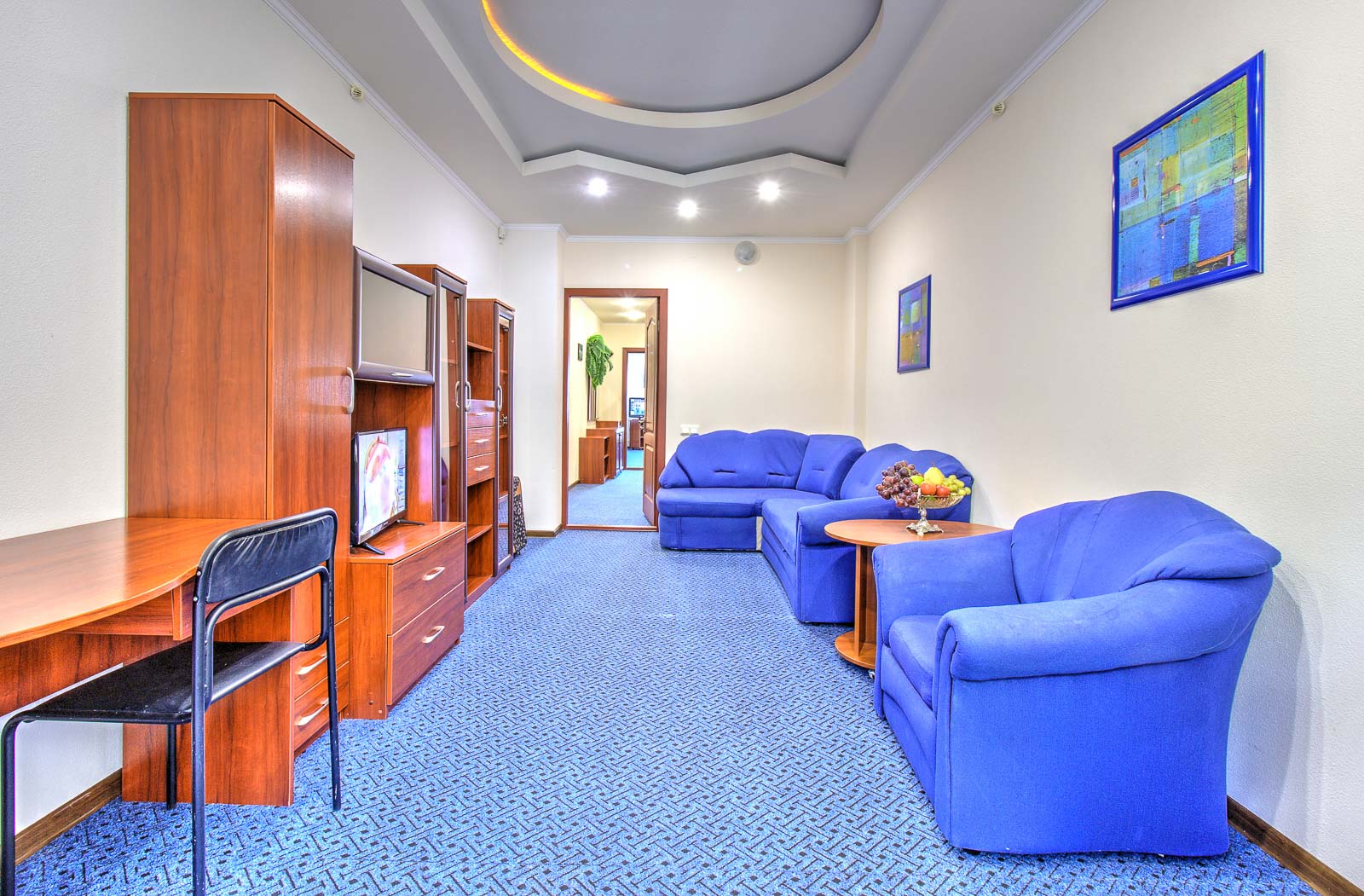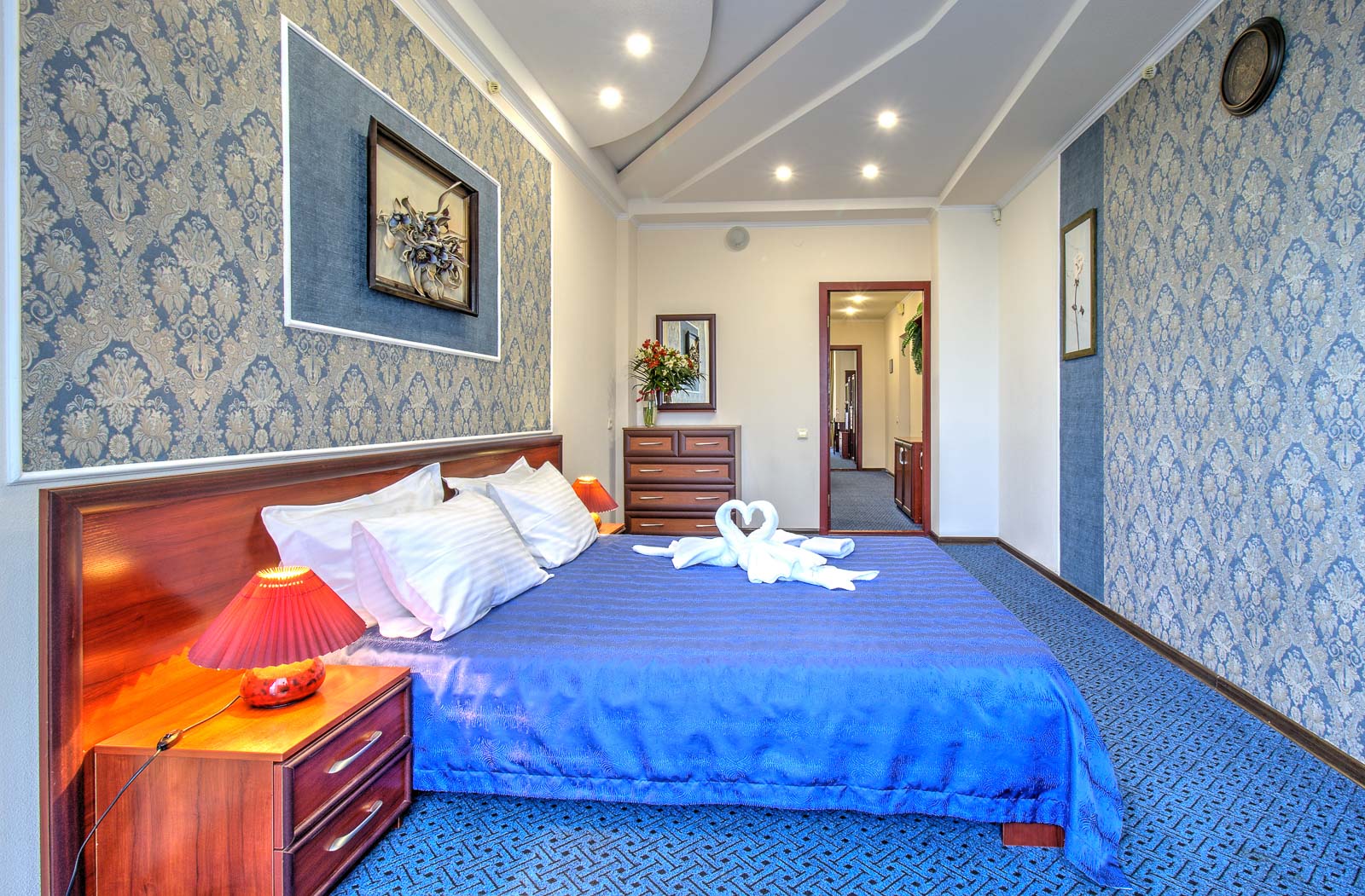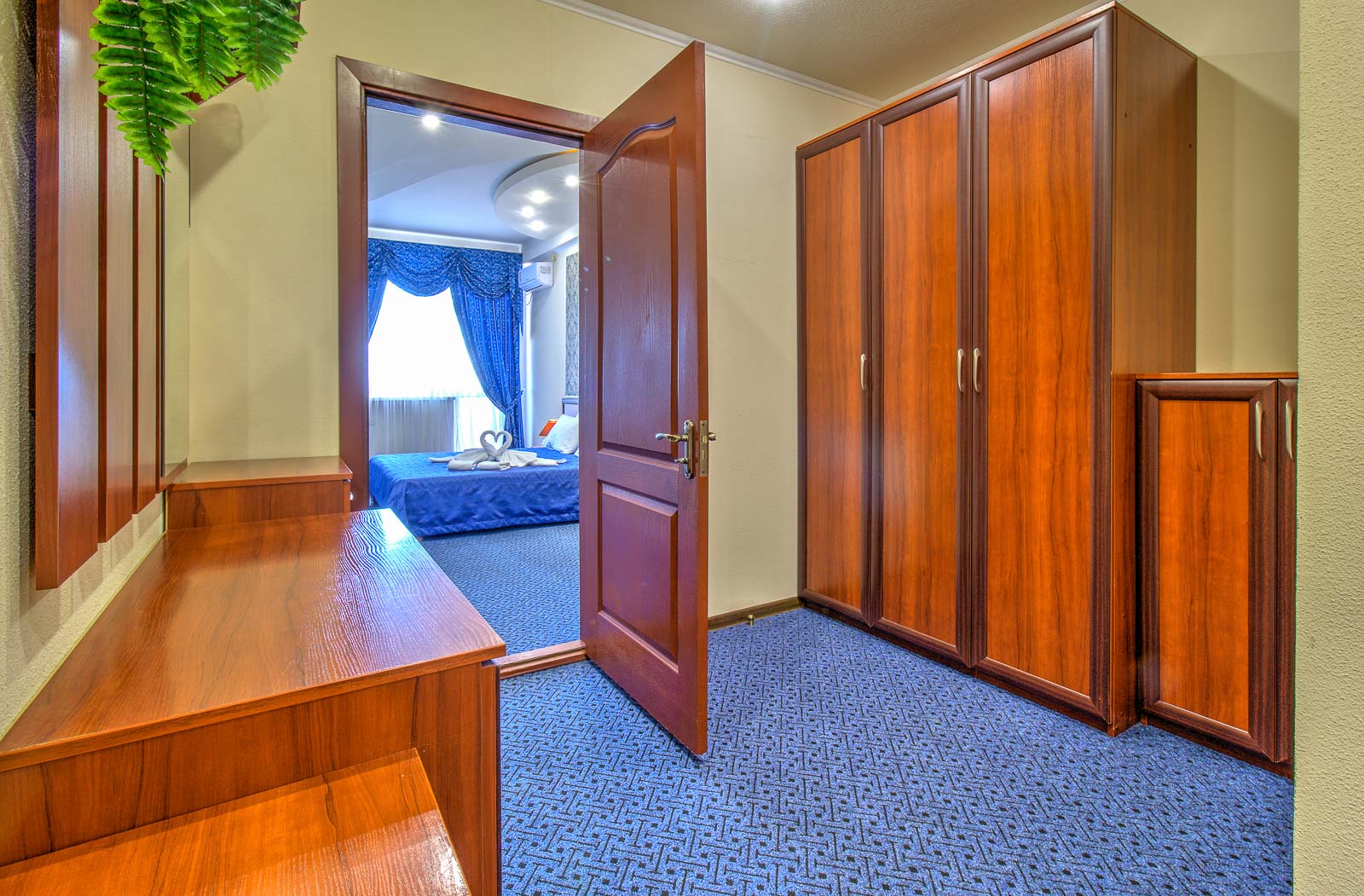 Площадь номера - 50 кв.м. 2 осн. места. 4 доп. места. Балкон. Мебель: вешалка, диван, зеркало, кресла, кровать двуспальная, прикроватные тумбочки, шкаф. Оборудование: кондиционер, телевизор, холодильник, электрочайник. Санузел: с душем, туалетные принадлежности, фен. Сервис: Wi-Fi бесплатно, смена полотенец, смена постельного белья, уборка номера.