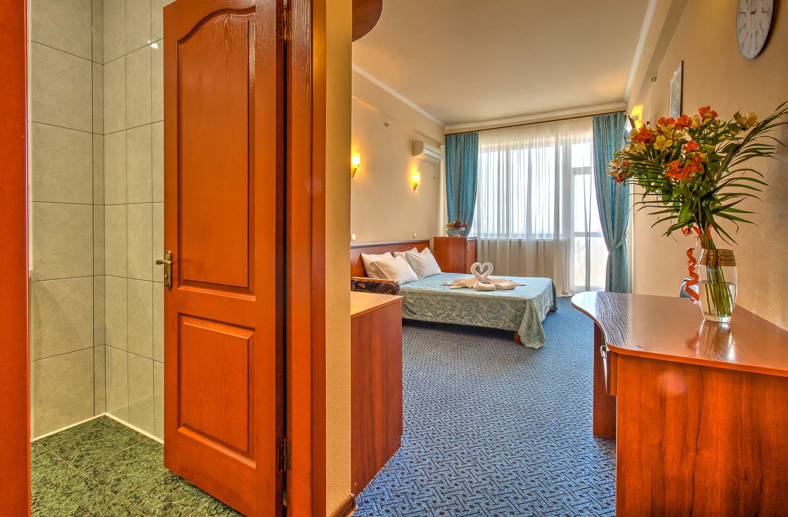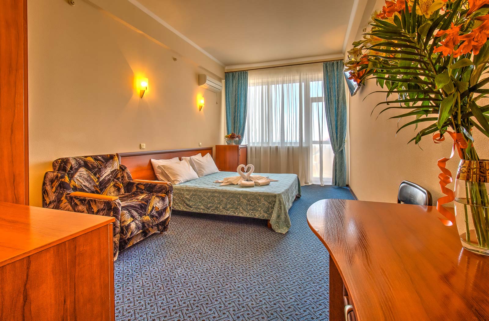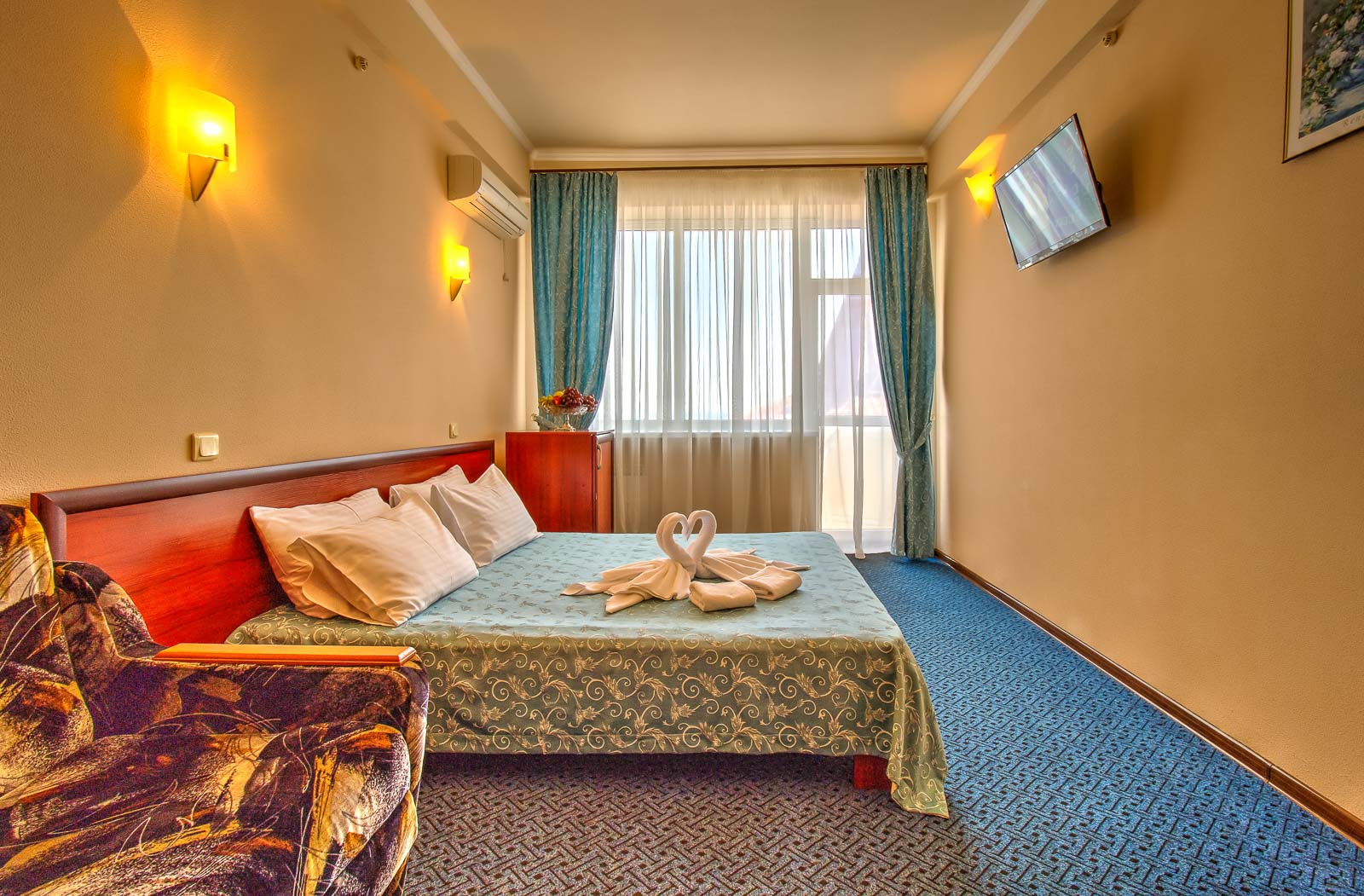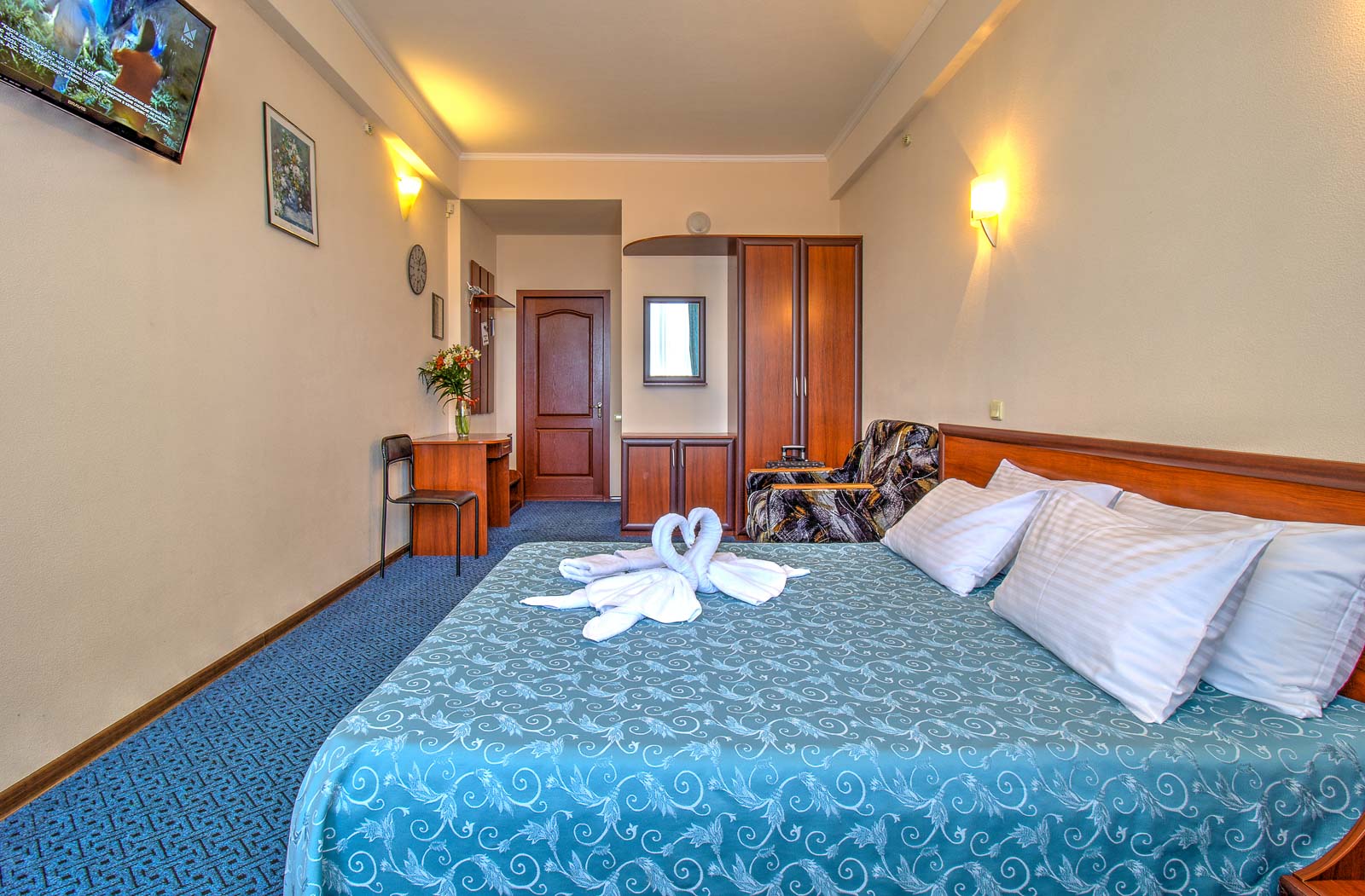 2 осн. места. 1 доп. место. Балкон. Мебель: вешалка, зеркало, кровати односпальные /одна двуспальная кровать, прикроватные тумбочки, стол, стулья, шкаф. Оборудование: кондиционер, телевизор, холодильник, электрочайник. Санузел: с душем, туалетные принадлежности, фен. Сервис: Wi-Fi бесплатно, смена полотенец, смена постельного белья, уборка номера.